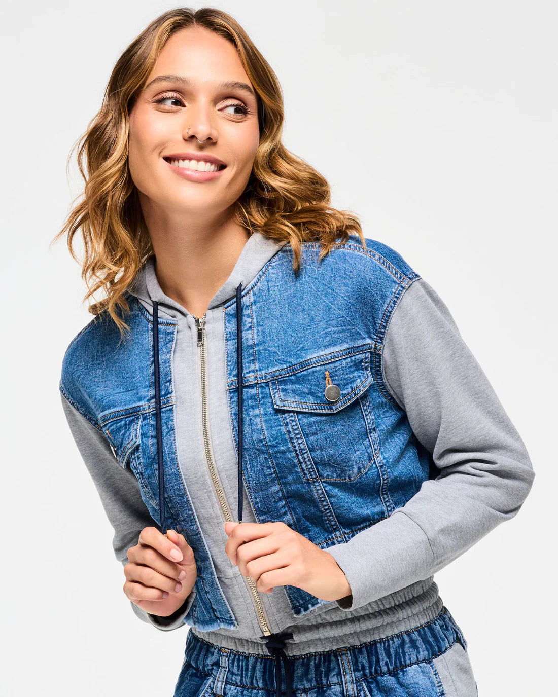 - Denim jacket with combo french terry sleeves, hood and front zipper placket