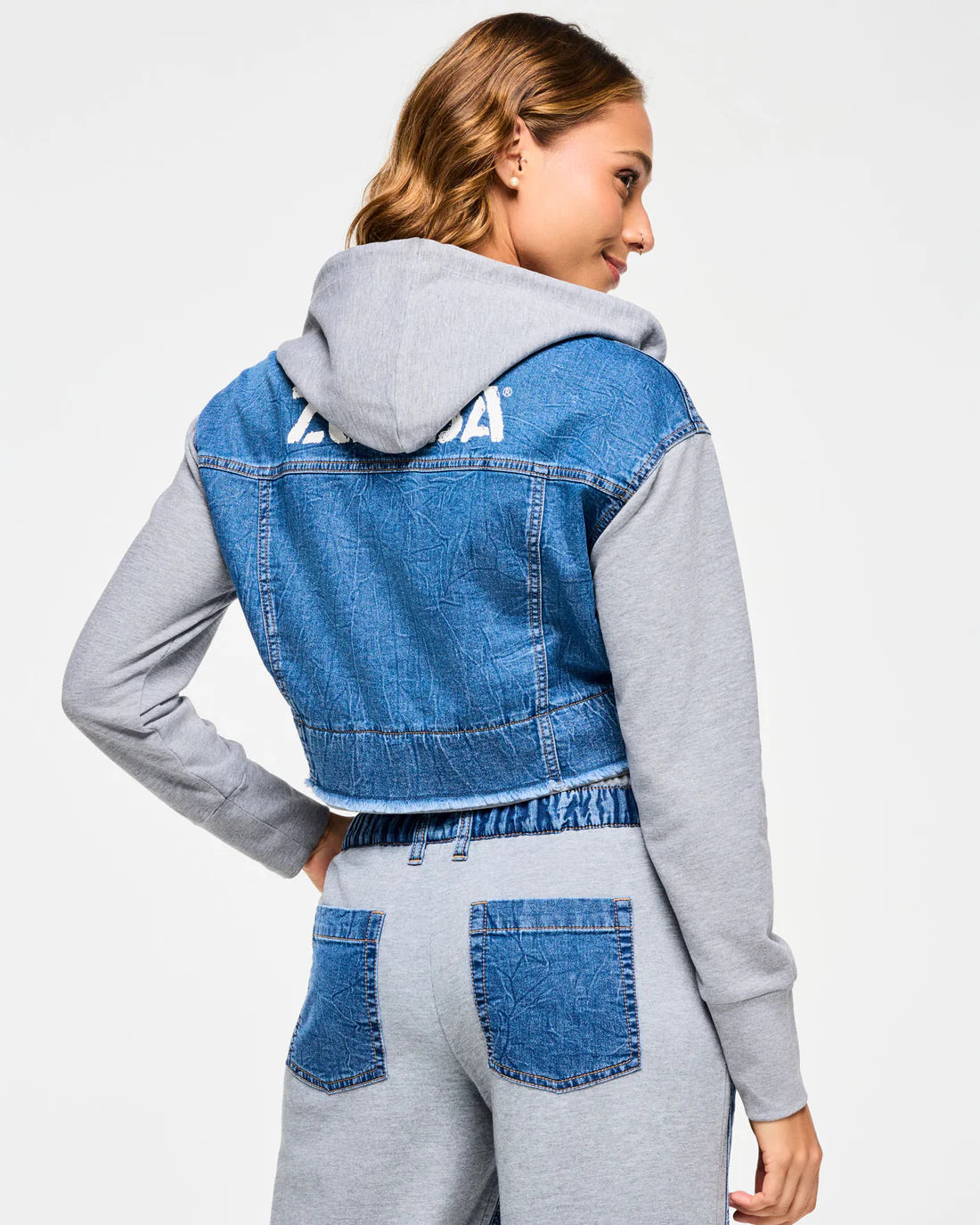 This Blue Jean Crop Zip-Up Hoodie blends stretch denim with soft French terry for unmatched comfort and flexibility. Featuring a front zipper, rib knit cuffs, and a hood with adjustable drawcords, it offers a relaxed, dance-ready fit that moves with you. The contrasting color block panels add a stylish edge, making it perfect for Zumba, workouts, or casual wear. With bold Zumba branding and a raw edge finish, this cropped jacket transitions effortlessly from studio to street.