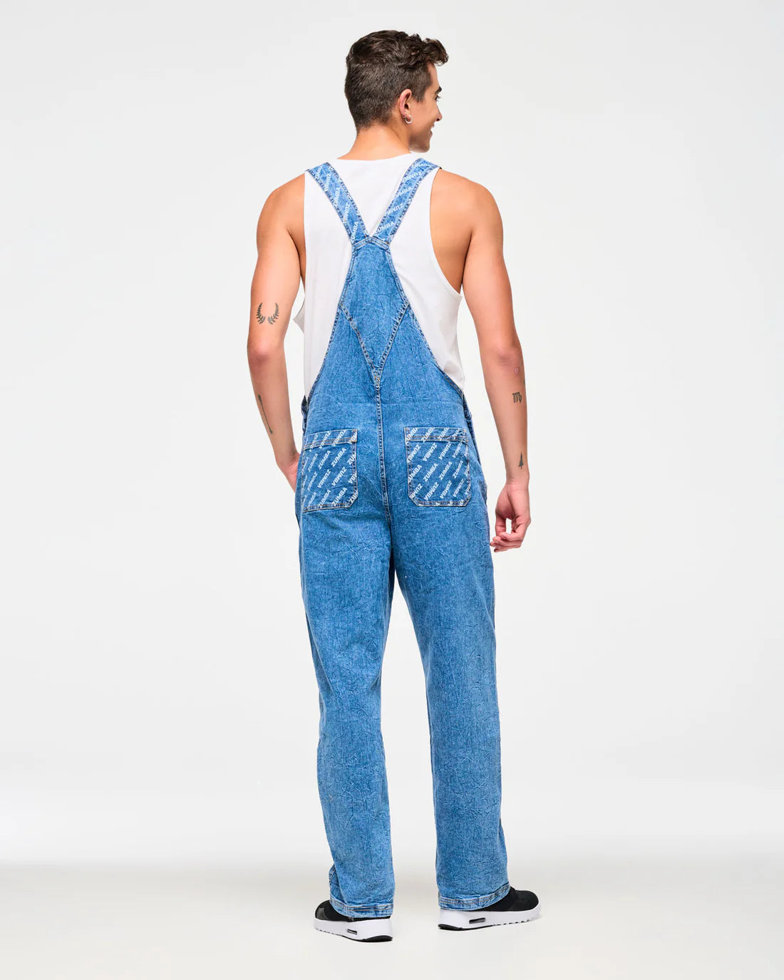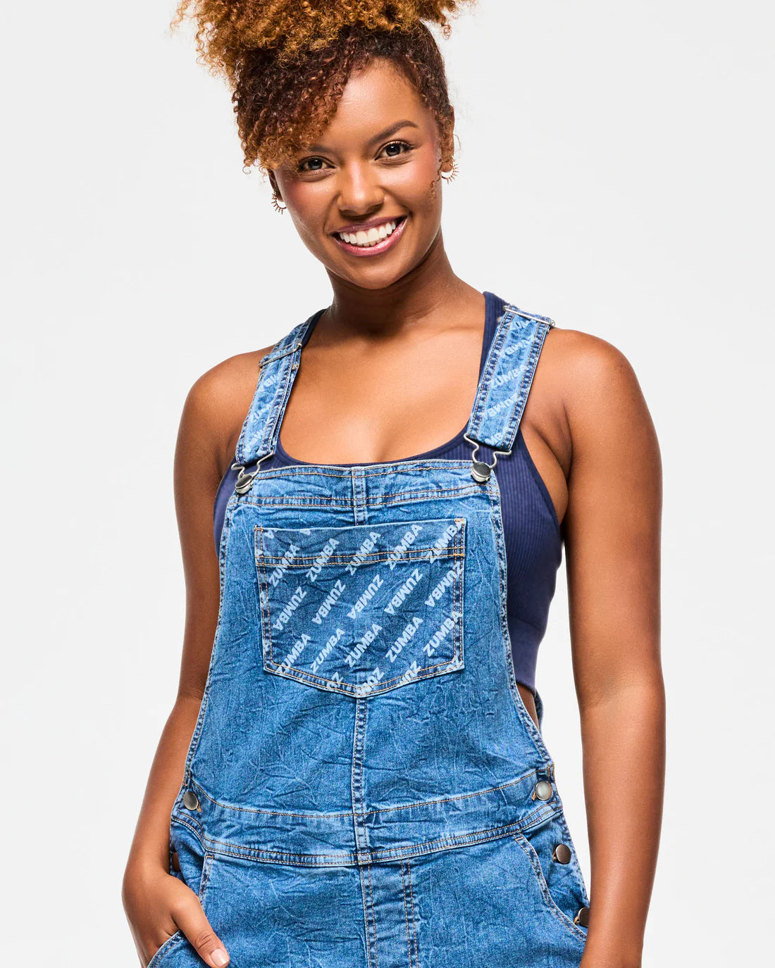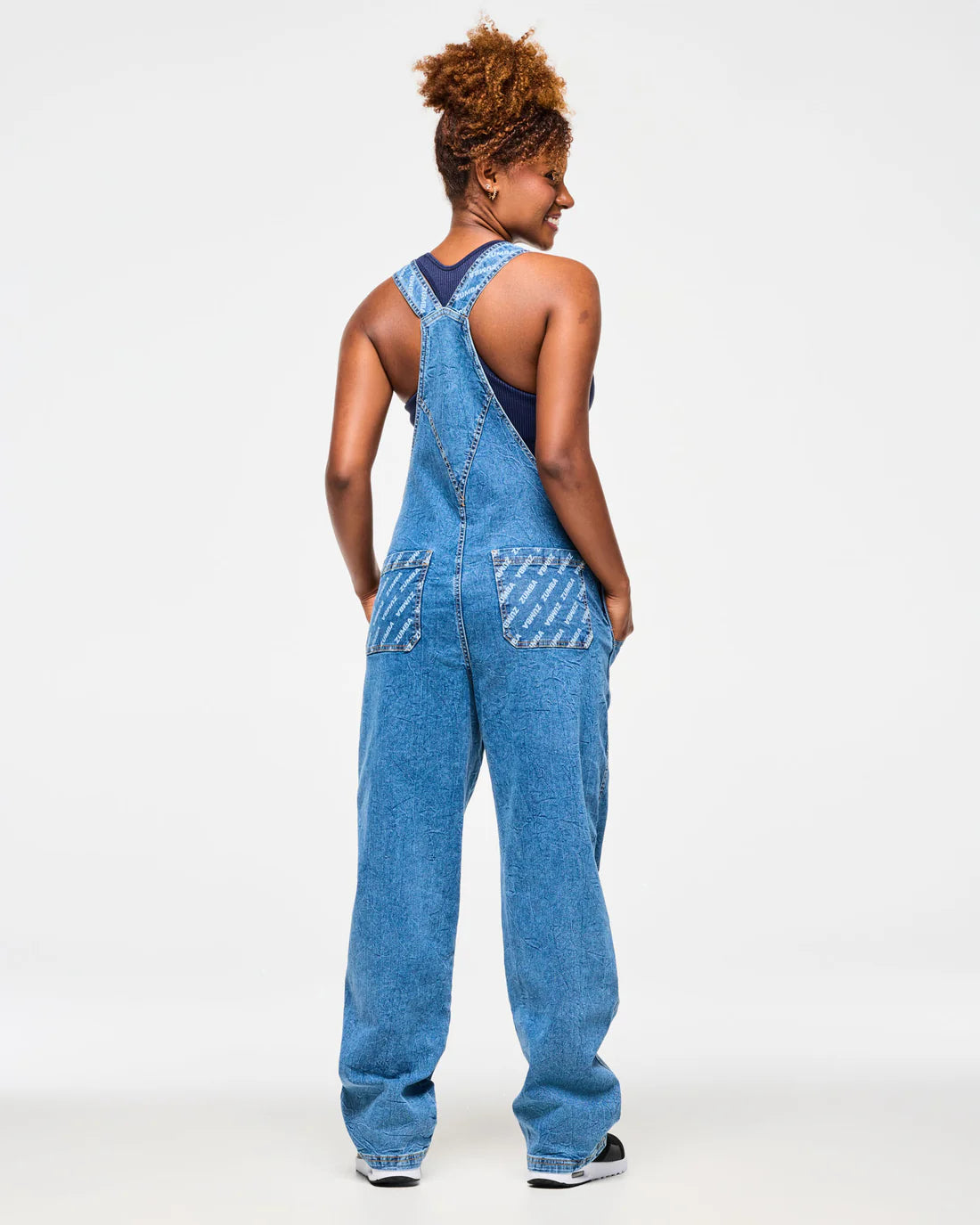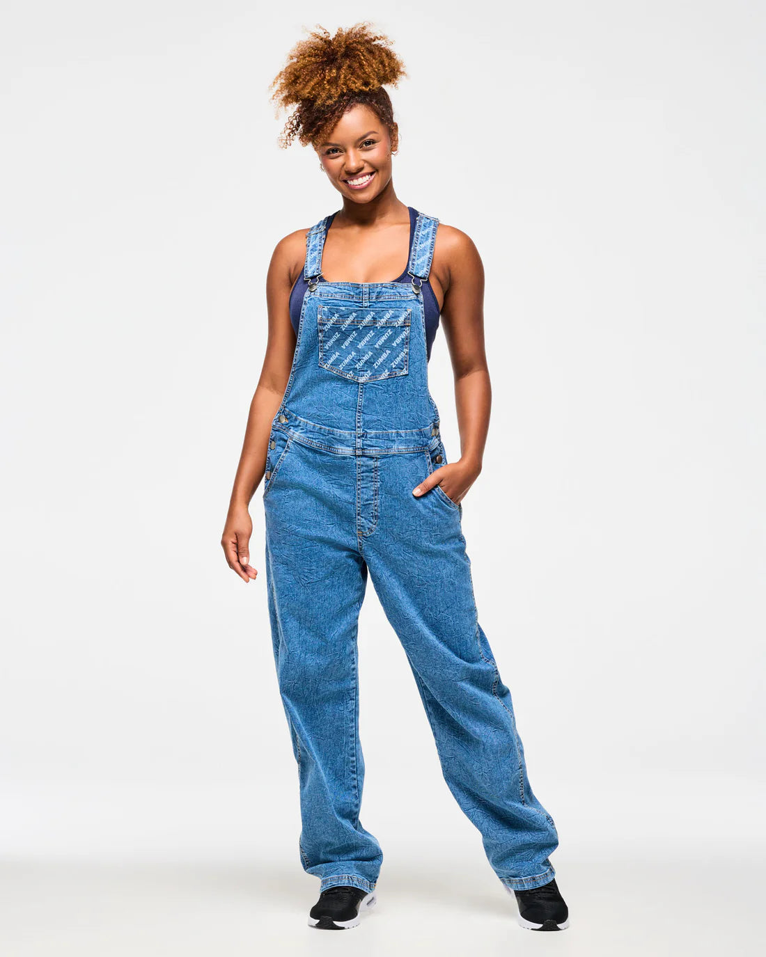 Featuring a 31" inseam perfect for cuff rolling, these blue jean denim overalls offer adjustable buckle straps and side button plackets for a customizable fit. Designed with practical front jean pockets, a spacious chest pocket, and back patch pockets, they combine style and function. Each piece showcases a unique denim wash with a distinctive Zumba branded discharge print, ensuring no two are alike. With a relaxed, long-length fit, these overalls deliver comfort and individuality for your everyday wear.