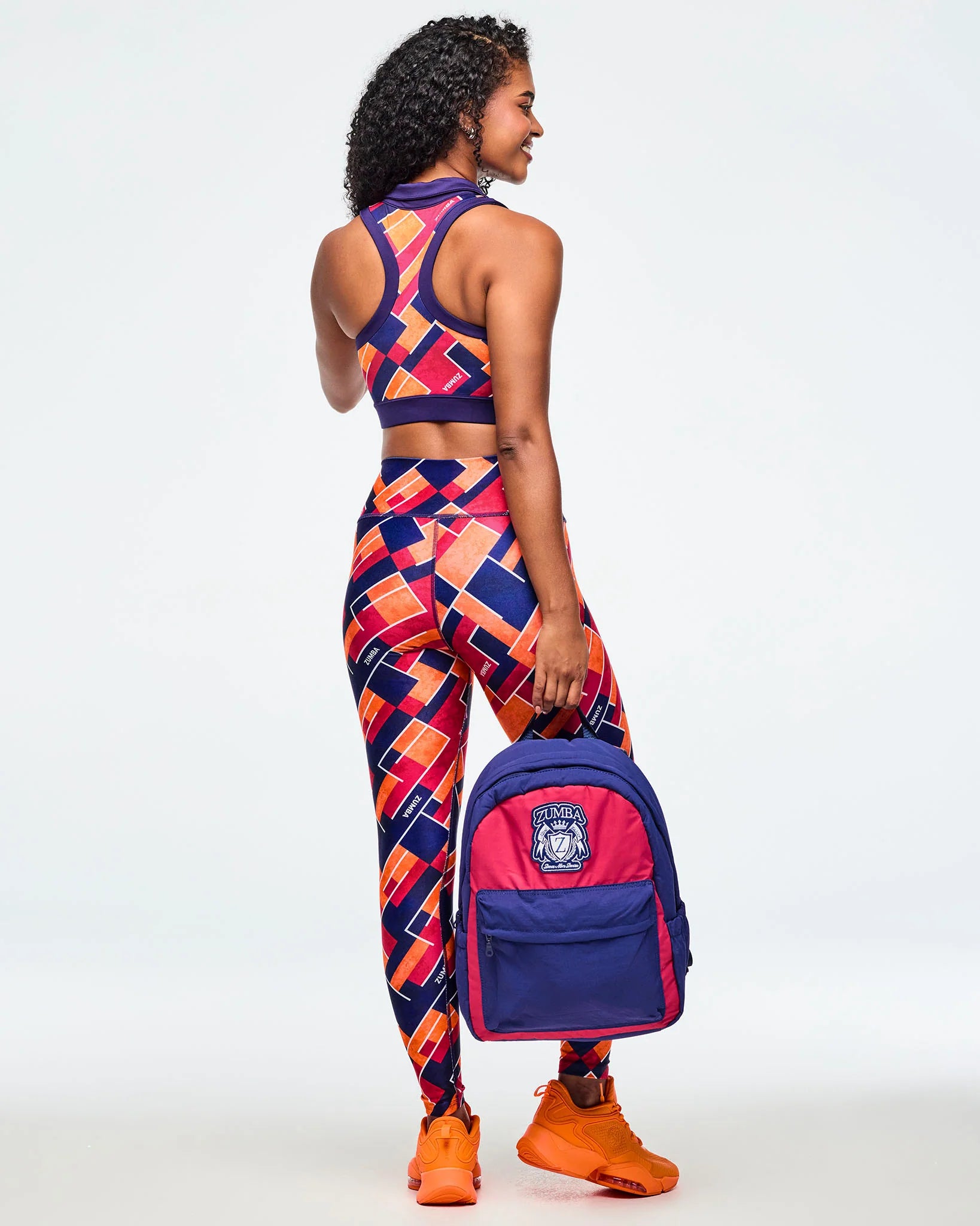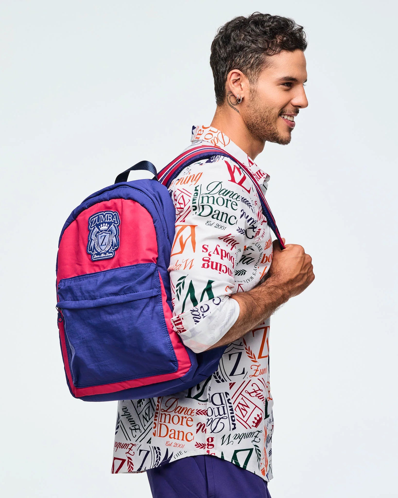 This color-blocked textured ripstop backpack features a lined interior and a two-way zipper main compartment for easy access. It includes a front zippered pocket with flap closure, elasticized top side pockets perfect for water bottles, and adjustable padded shoulder straps with an engineered stripe for added comfort. Sized at 16.5" high, 12" wide, and 5.25" deep, it offers an internal back pocket ideal for laptops or separating clothes and shoes. The embroidered Zumba crest adds style, while the back loop makes it easy to attach to carry-on luggage.