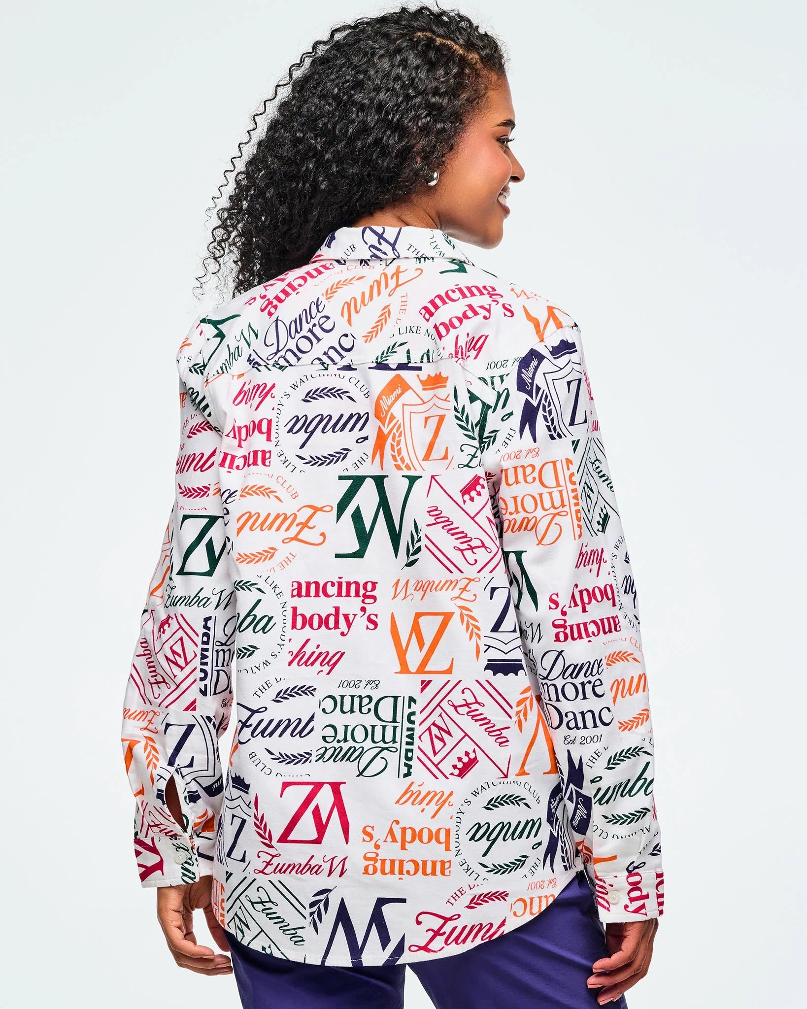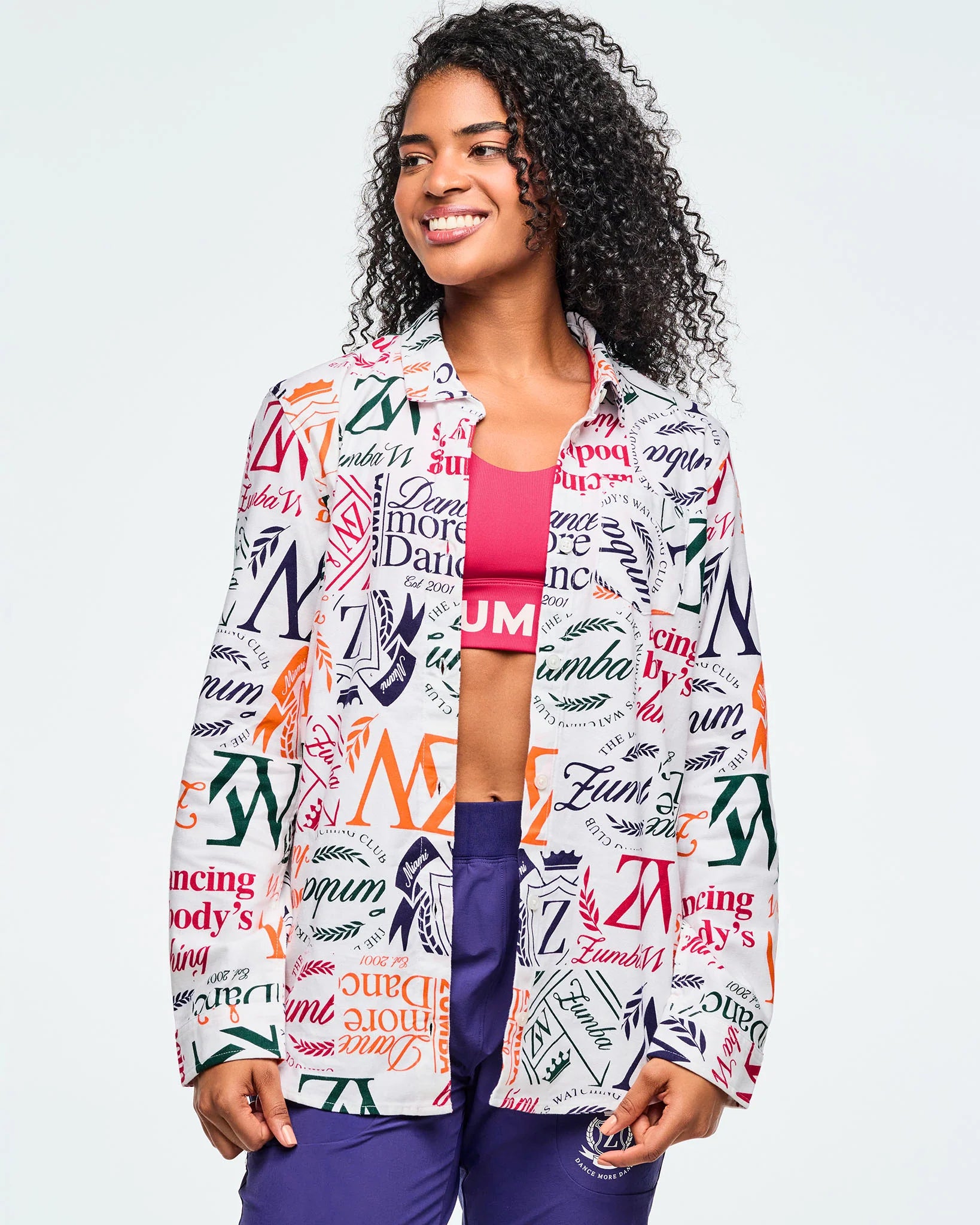 This woven button-up shirt features a back yoke and comes with an extra button for added convenience. Showcasing a unique Zumba-exclusive all-over print, it offers an easy fit and extended length for comfortable, stylish wear.
