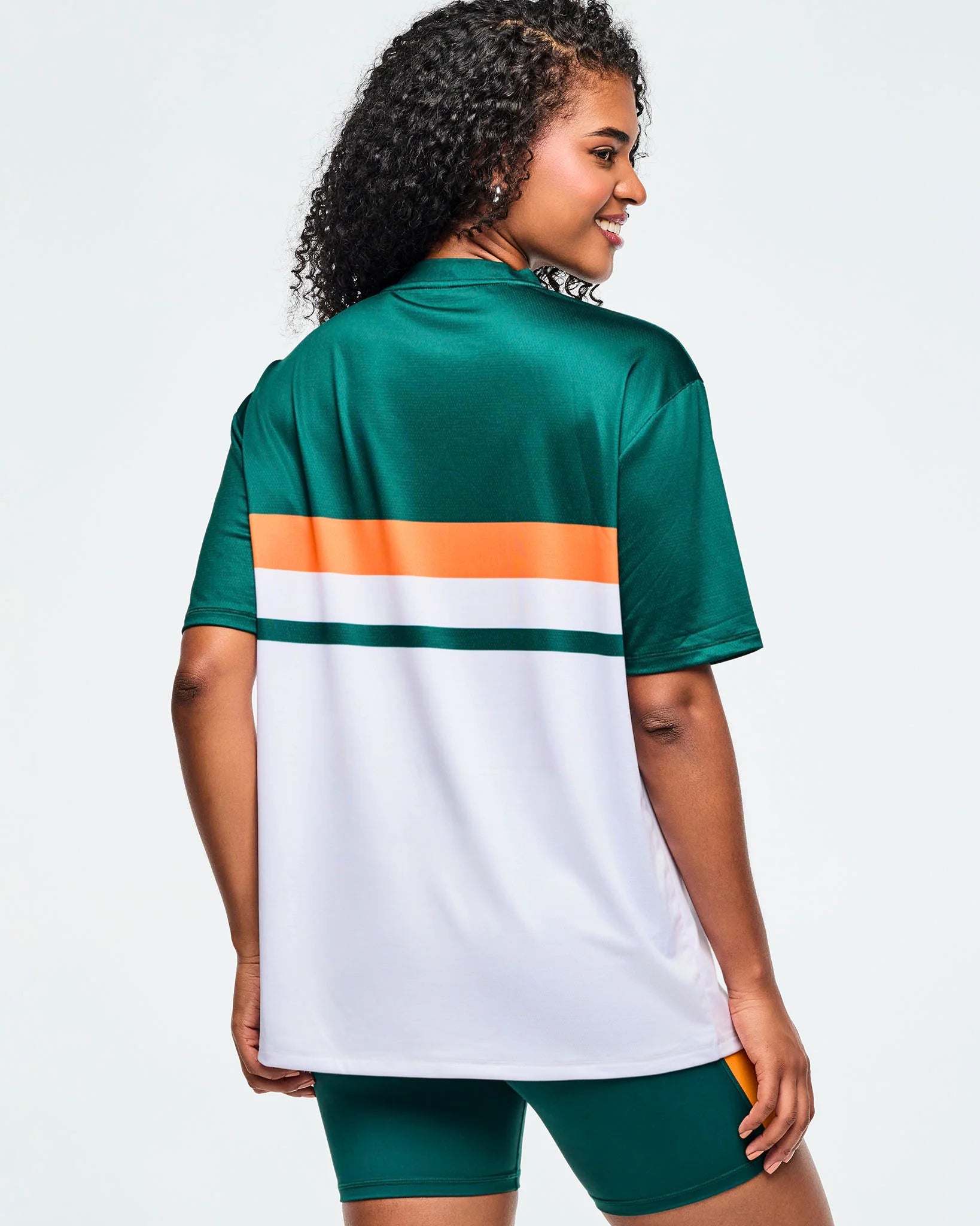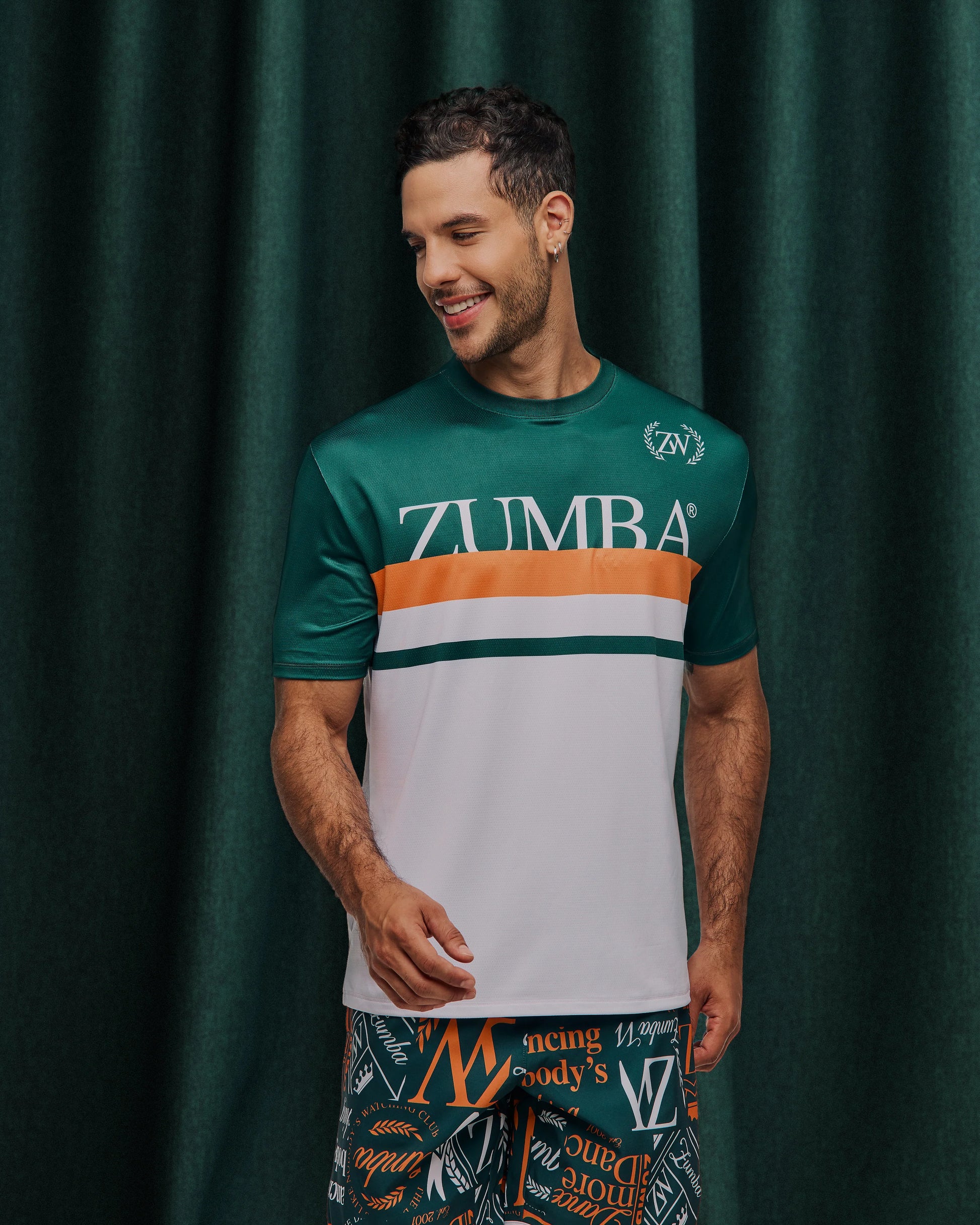 This men's mesh top features a rib knit collar and a lightweight, precisely crafted front graphic with striking color blocking. Designed with a relaxed fit and extended length, it ensures comfortable wear with bold style.