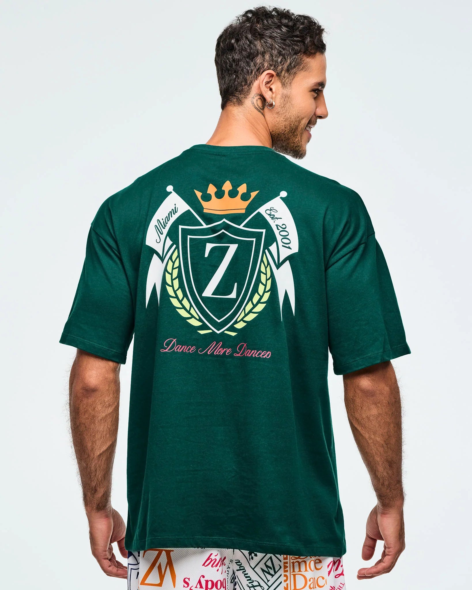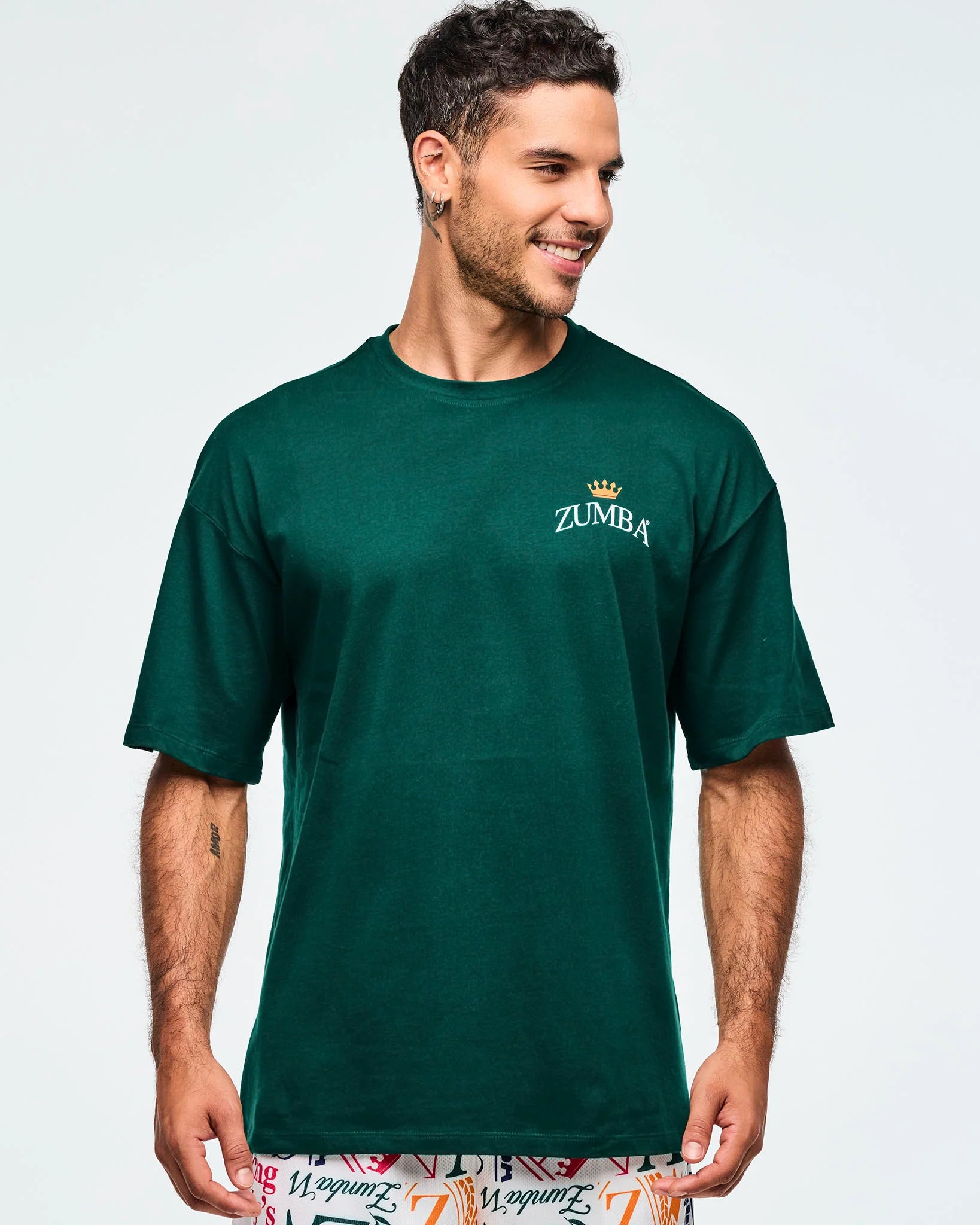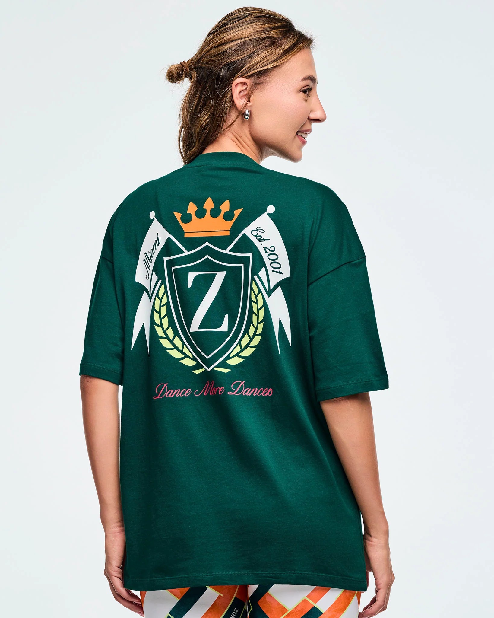 Featuring a rib knit collar and an oversized drop shoulder design, this top showcases branded artwork on the chest and a large, exclusive Zumba graphic on the back. With its roomy fit and extended length, it delivers both comfort and standout style.