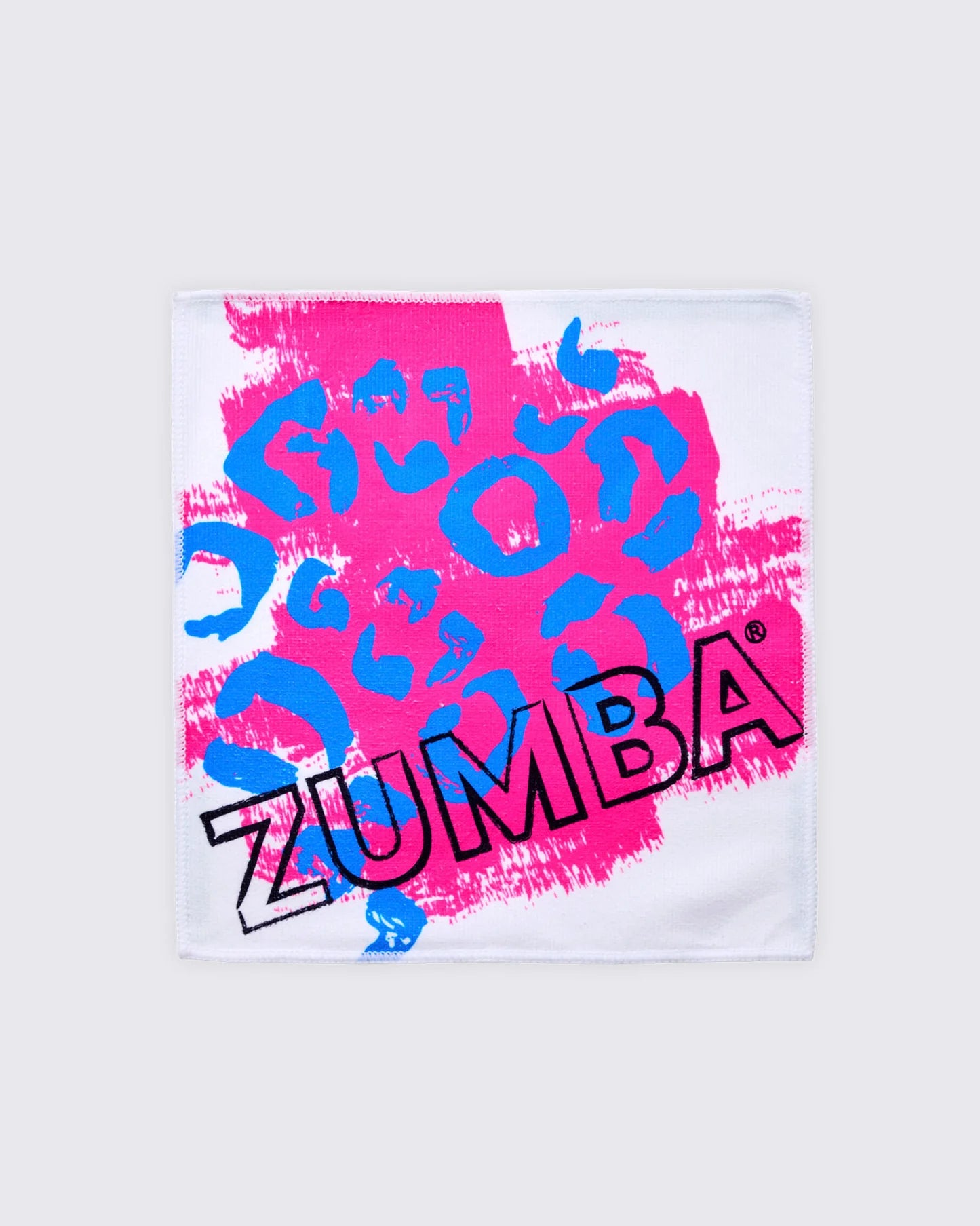 - Towel #2 has a pink paint stroke covering with blue animal print and a hand-drawn style Zumba