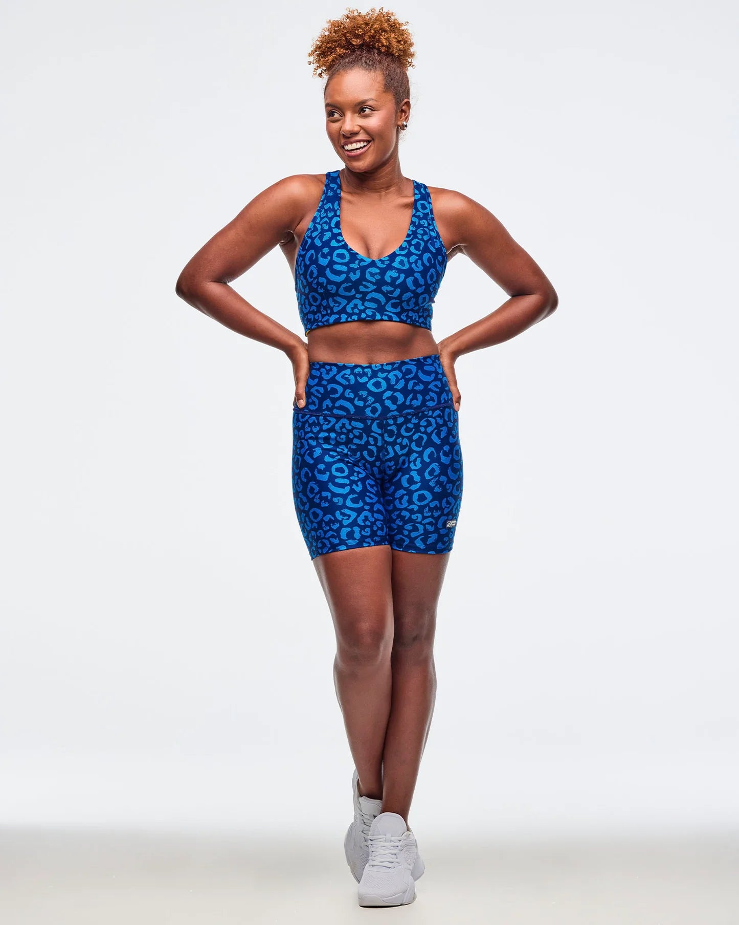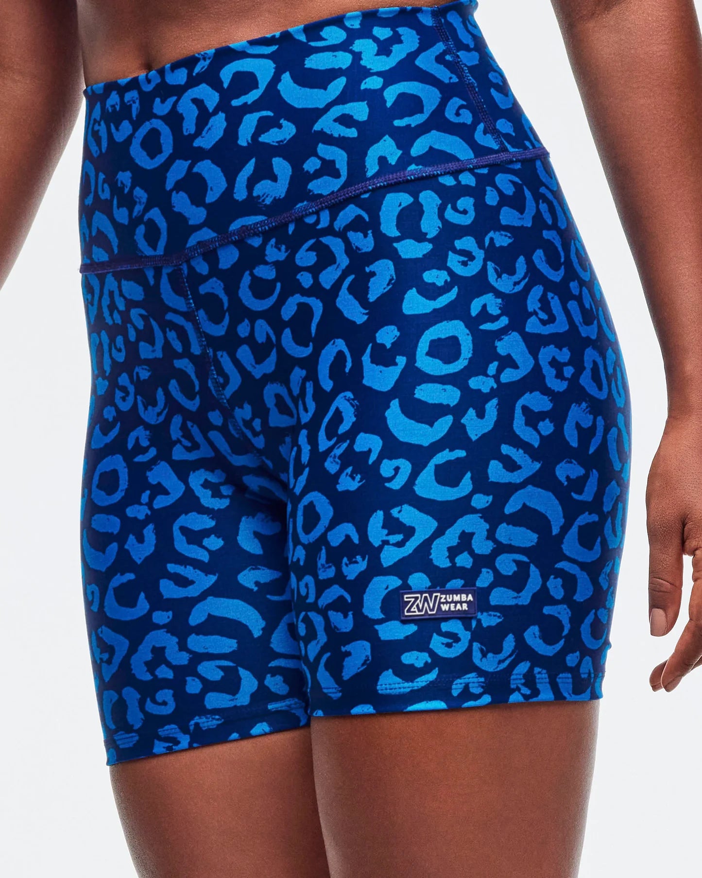 These high-waisted biker shorts feature a 5 1/2" inseam and an encased elastic waistband for secure, comfortable support. Showcasing a bold, exclusive Zumba all-over print and a branded rubber patch on the back waistband, they offer a slim fit and a flattering short length ideal for active wear.