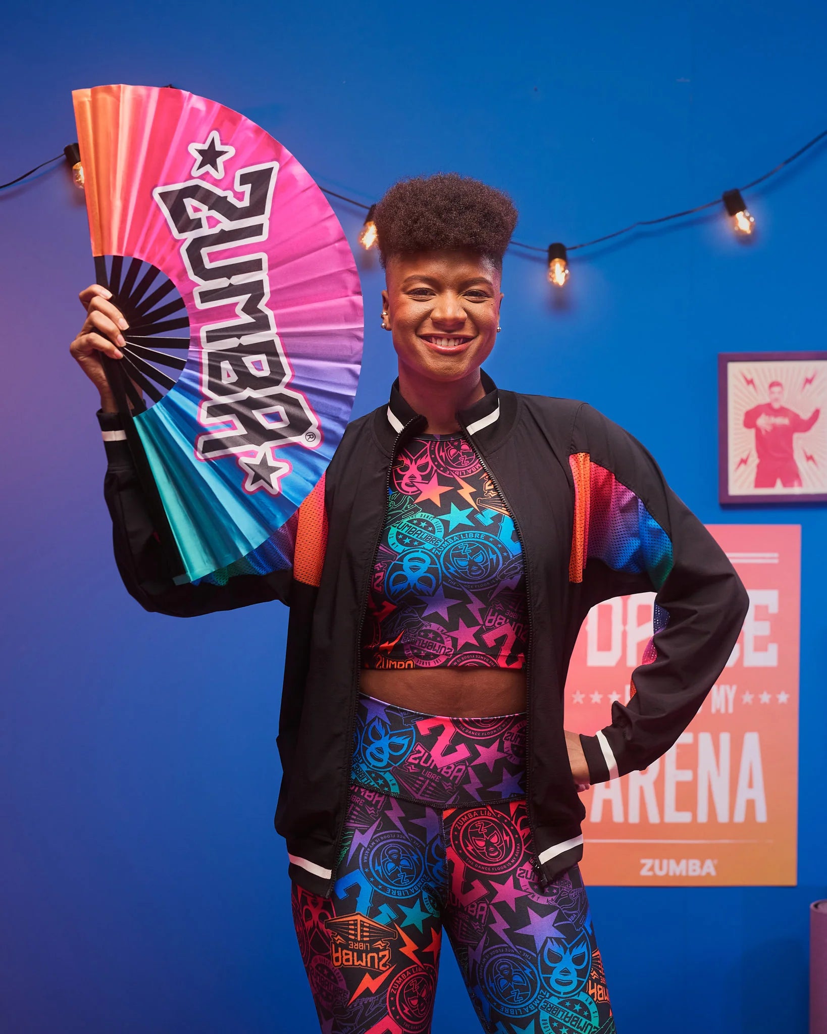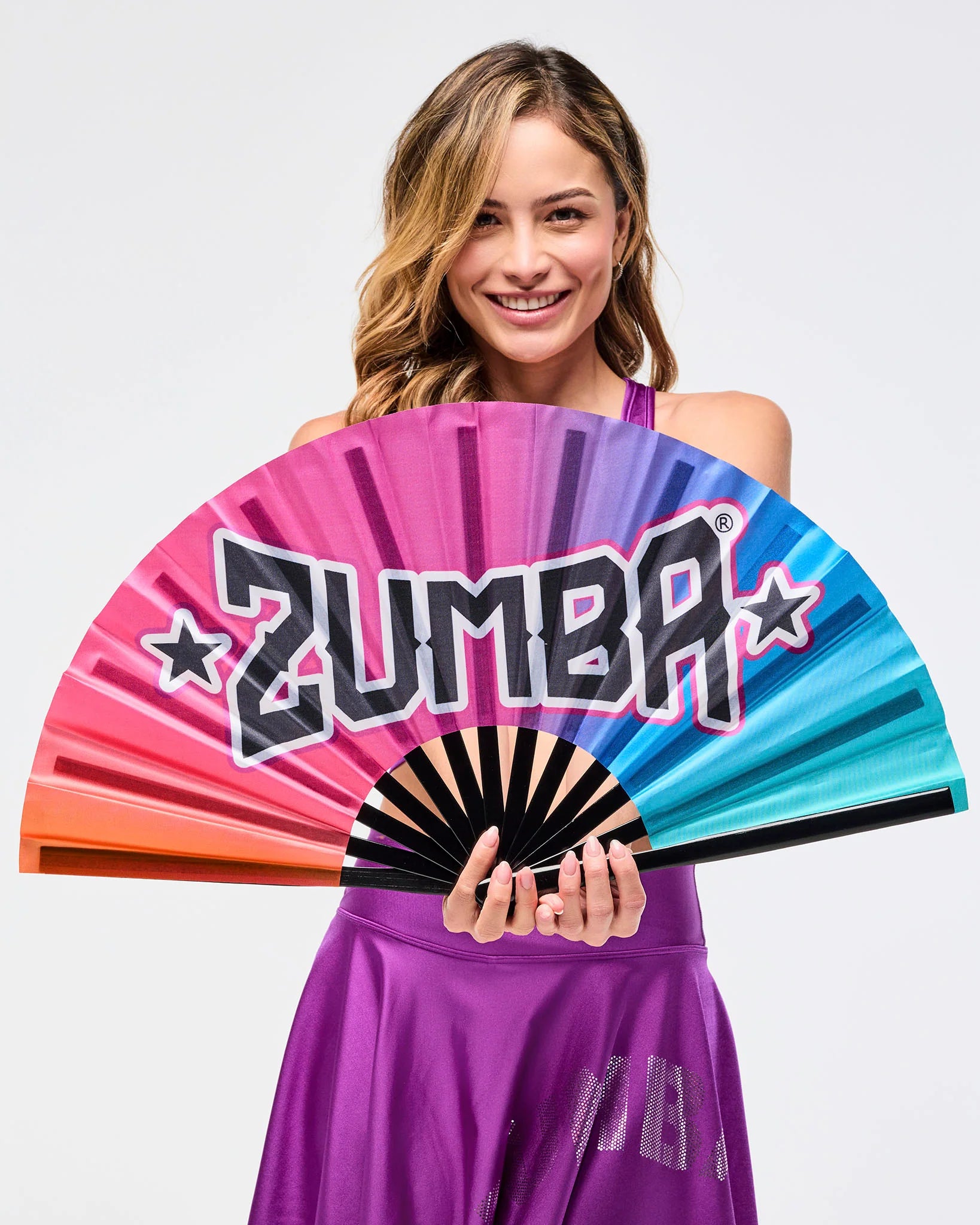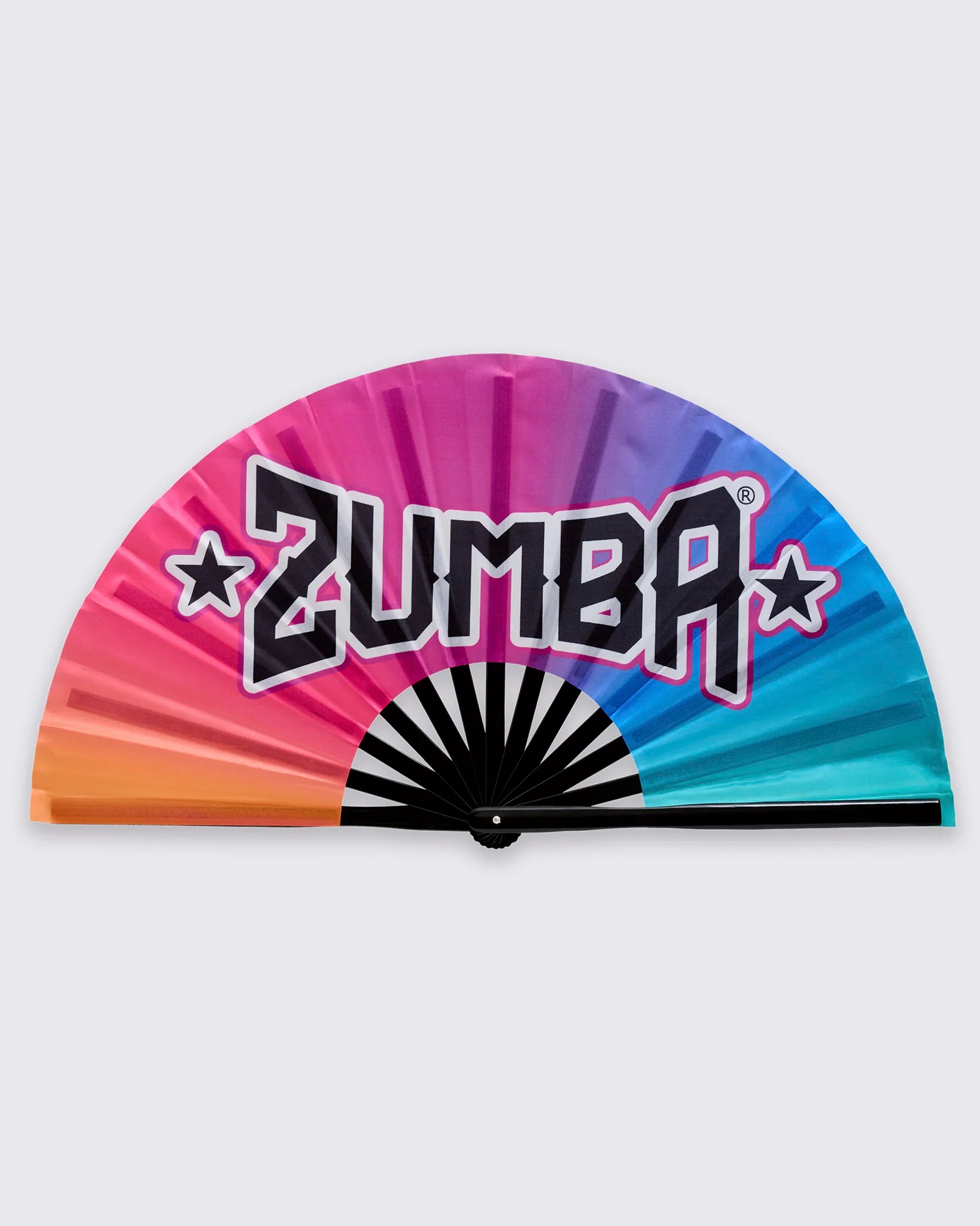 - Ombre hand fan with bold outlined Zumba surrounded by stars