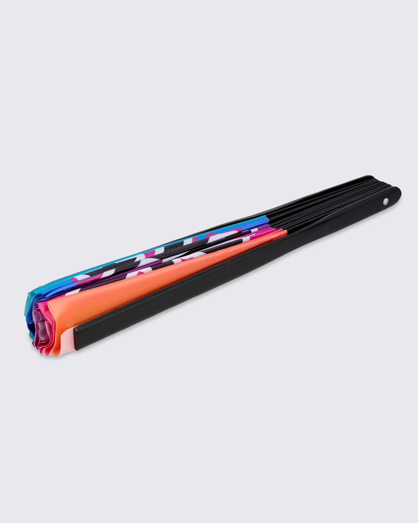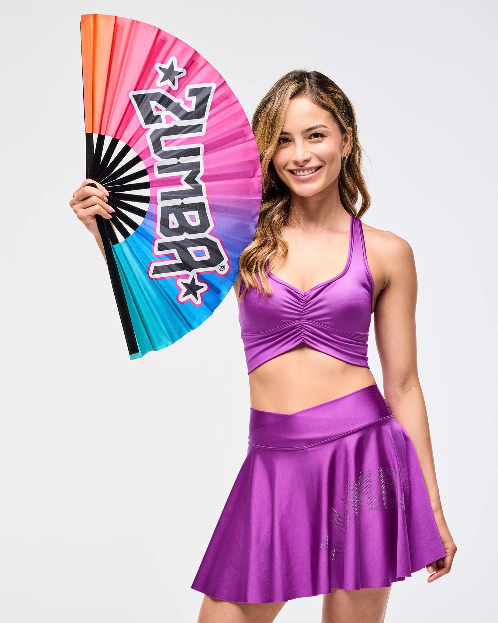 This ombre hand fan showcases a bold outlined Zumba design encircled by stars. Crafted with bamboo sticks, it combines durability with eye-catching style.