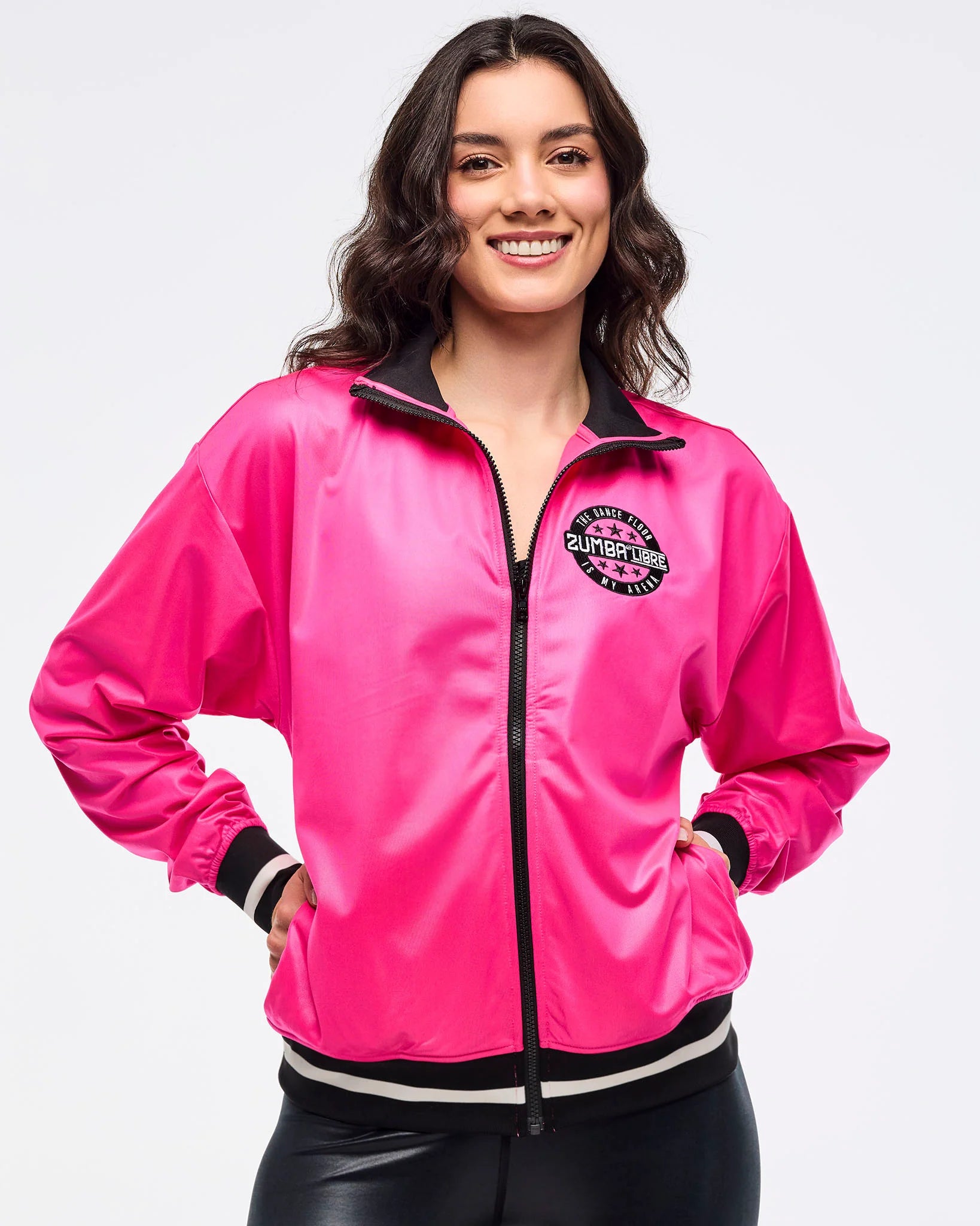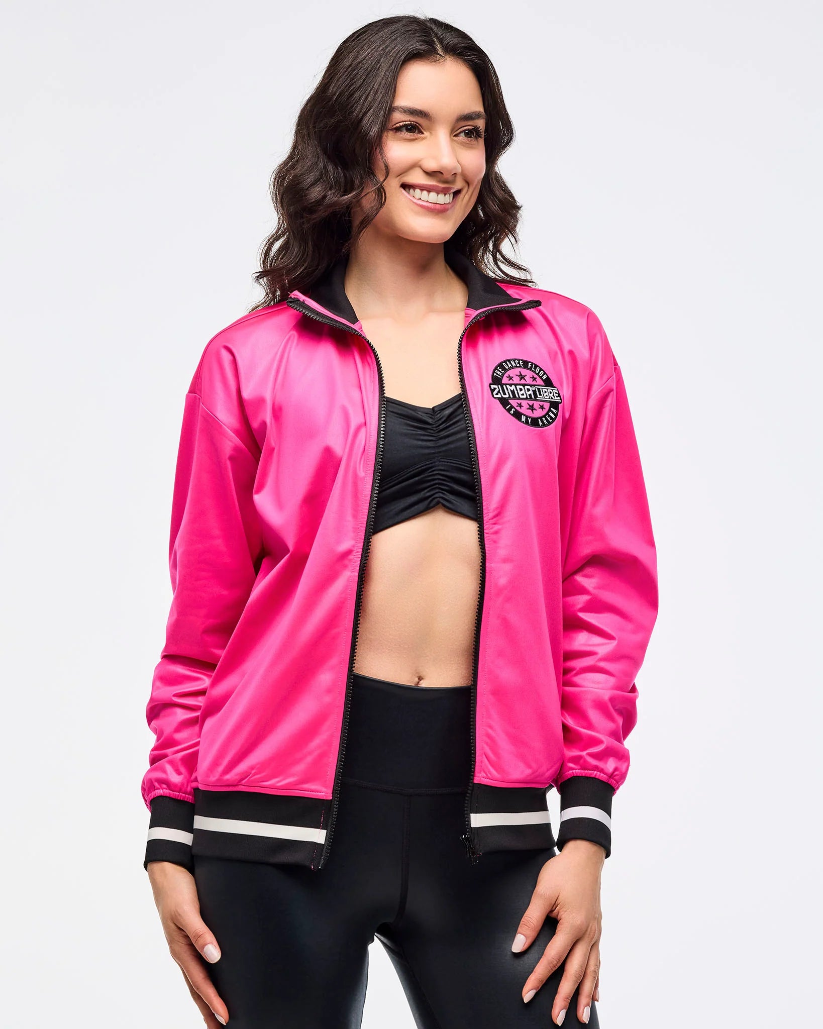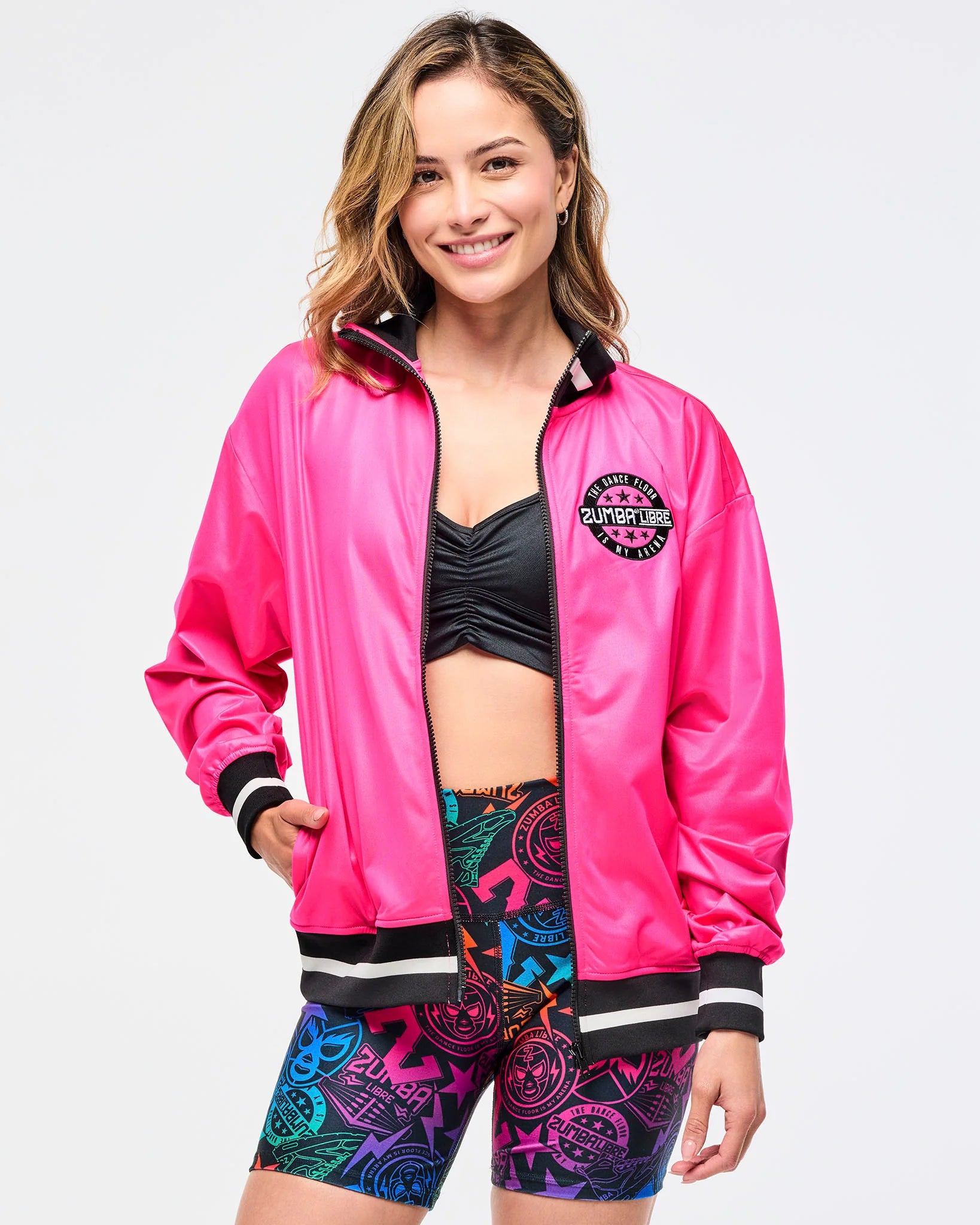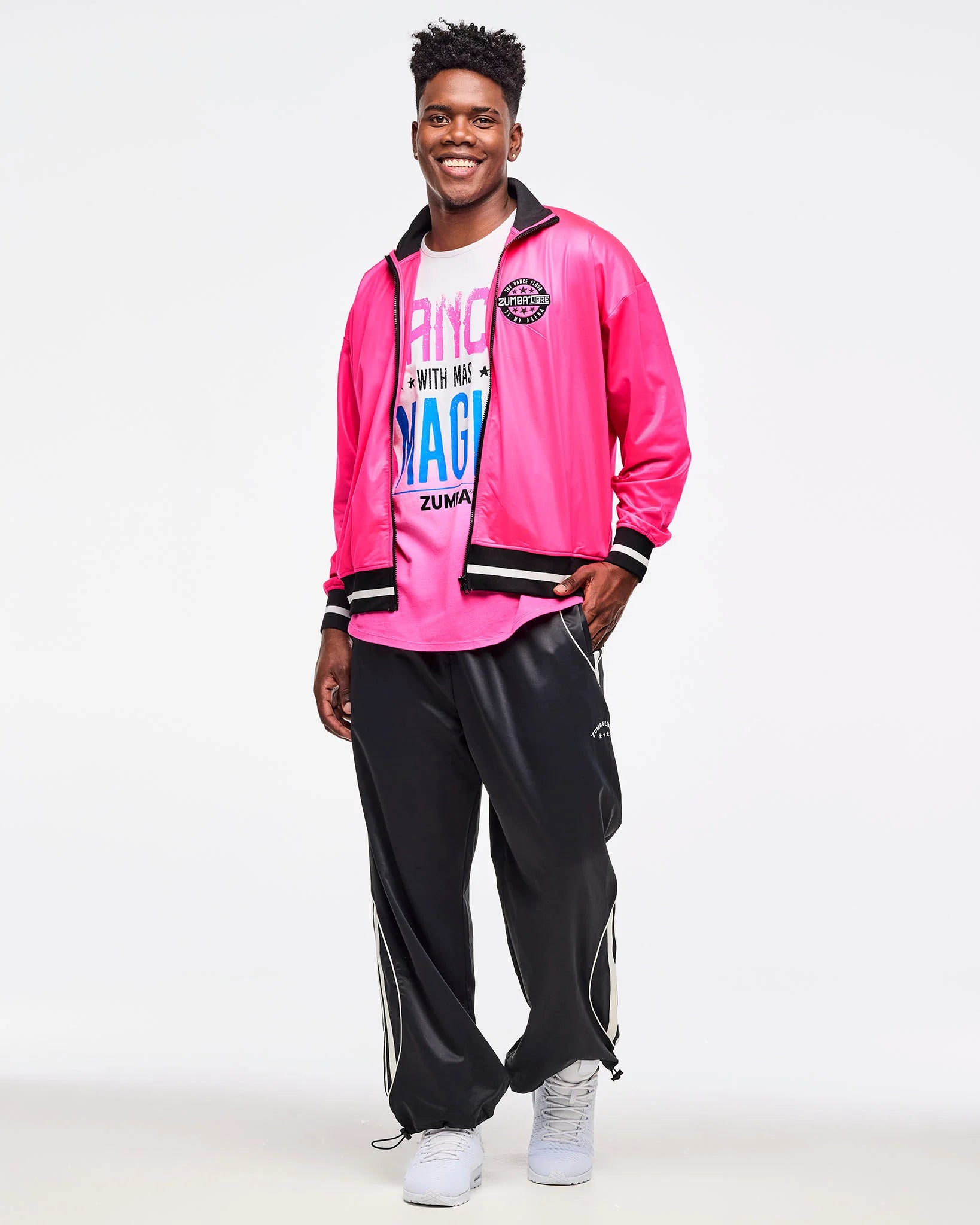This unisex oversized track jacket features a front zipper closure and inseam pockets for practicality. It is crafted from high-shine tricot fabric and detailed with striped ribbing on the collar, cuffs, and hem. Embroidered artwork on the chest adds a stylish touch. With a relaxed fit and long length, it combines comfort and sleek design.