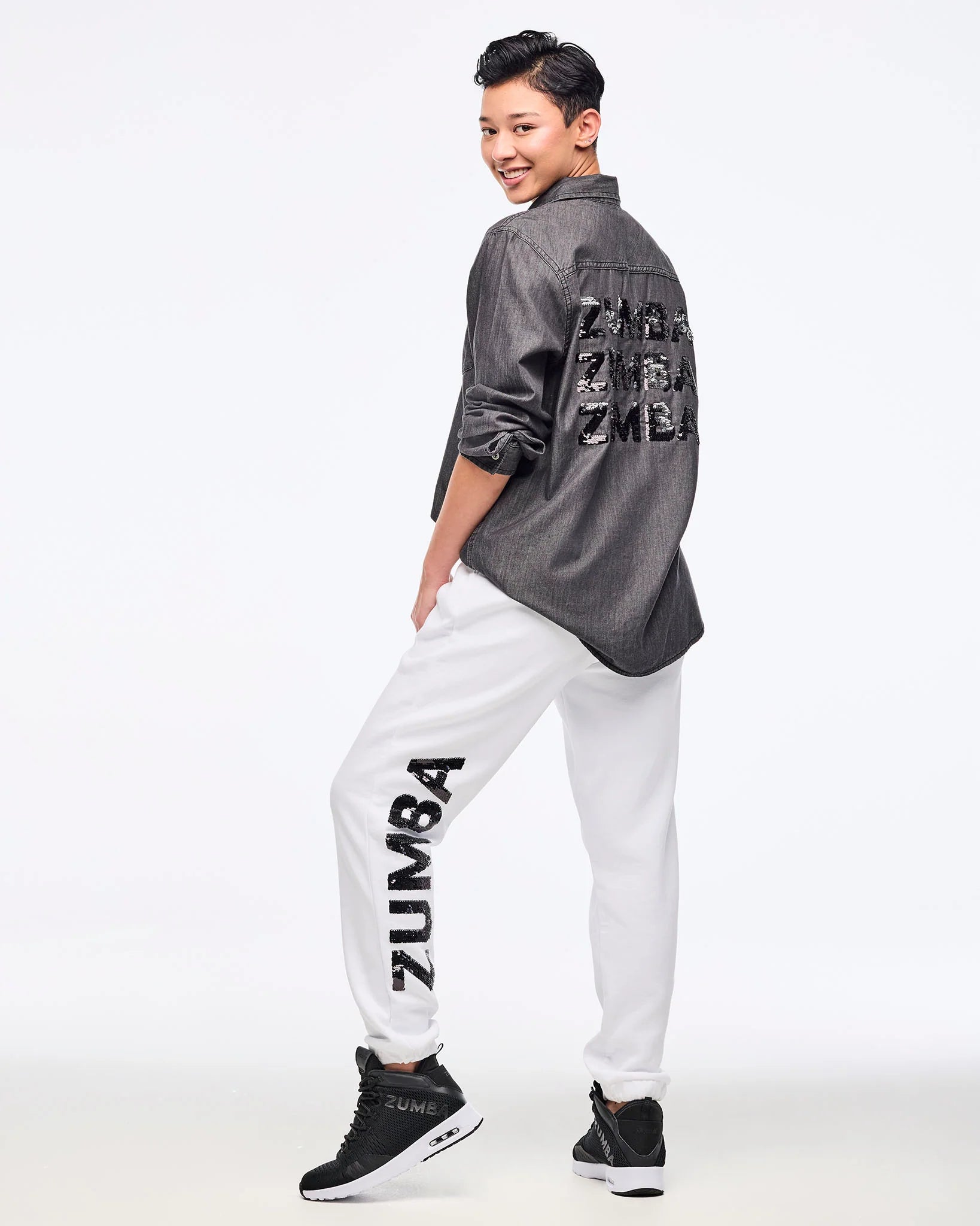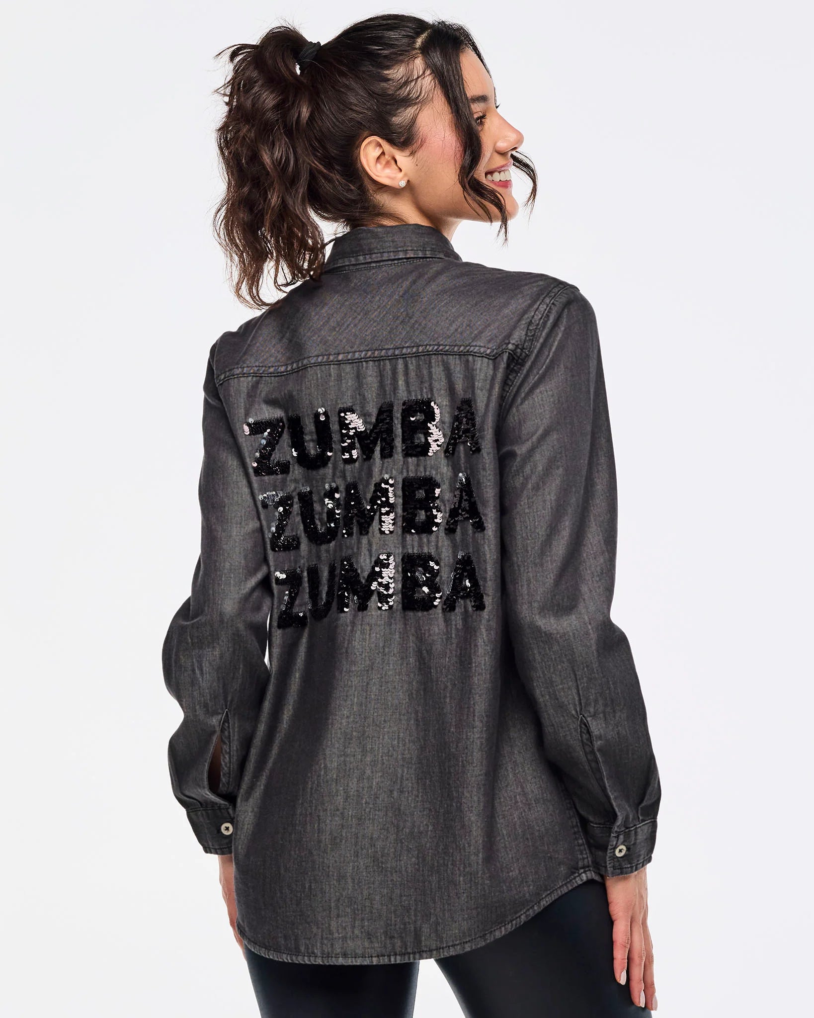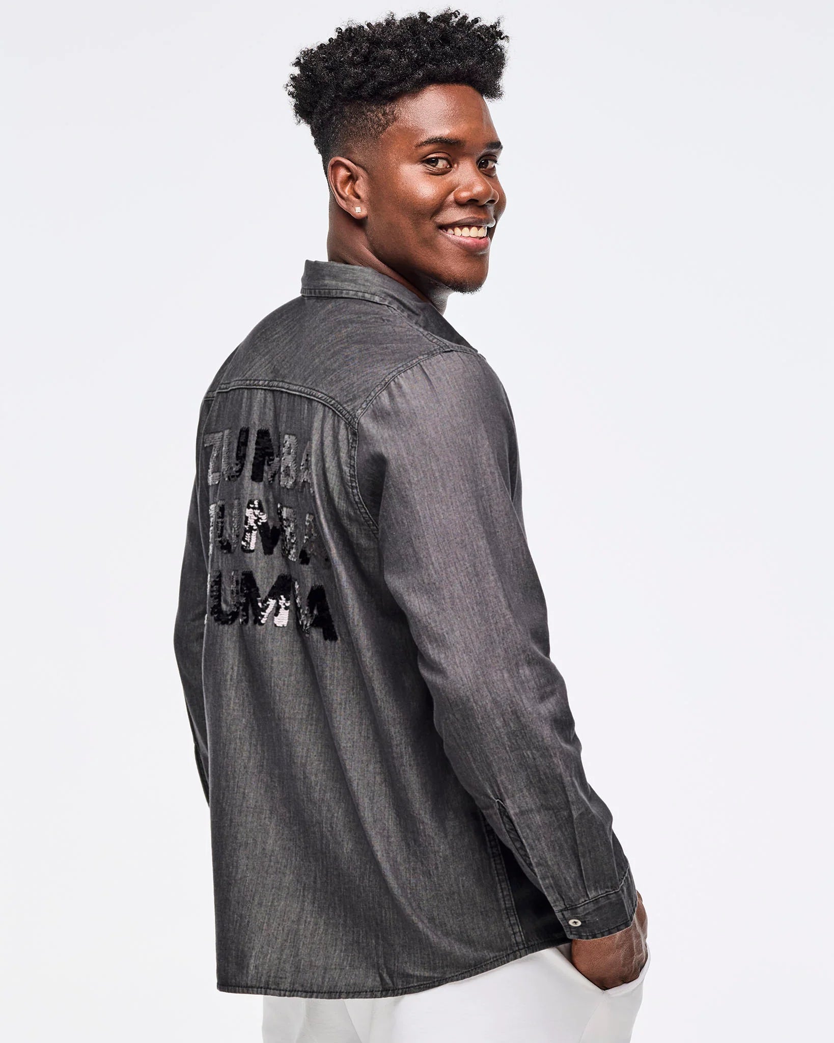 This button-down shirt features a front placket with working buttons, a back yoke, and a left chest pocket. The sleeves include functional buttoned cuffs for added style. Its multidirectional sequined designs shift from black when pushed down to silver when pushed up. With an easy fit and extended length, it combines comfort and dazzling appeal.