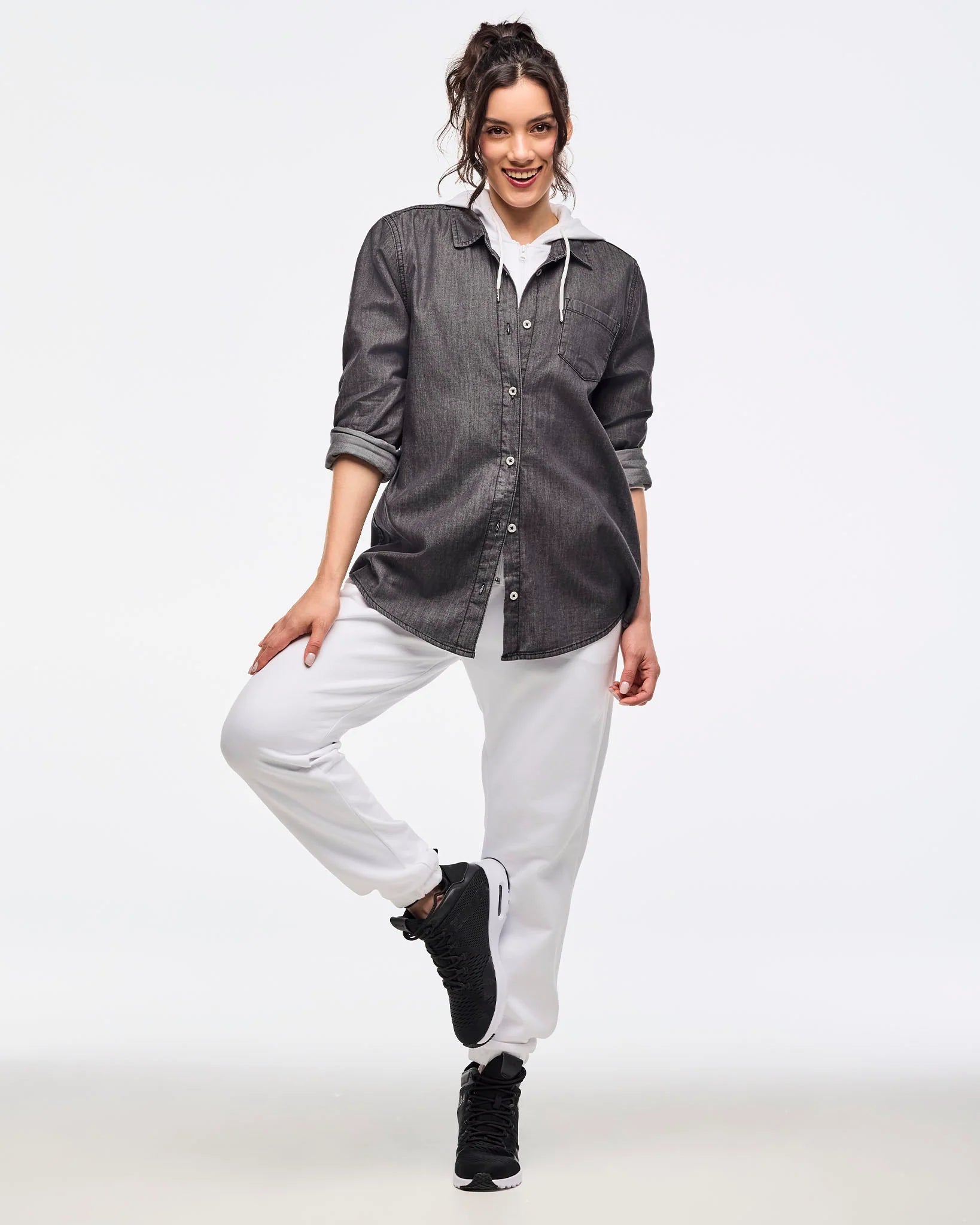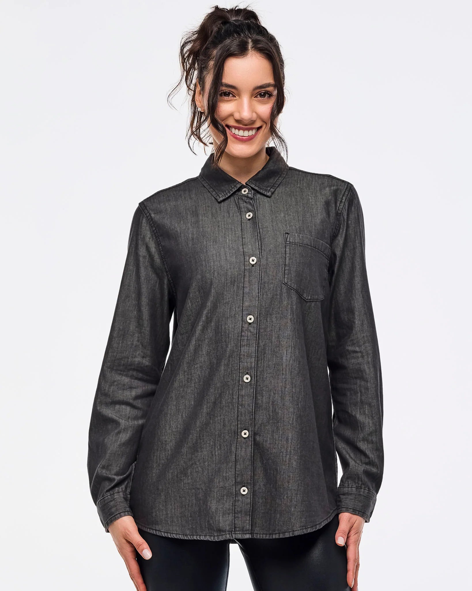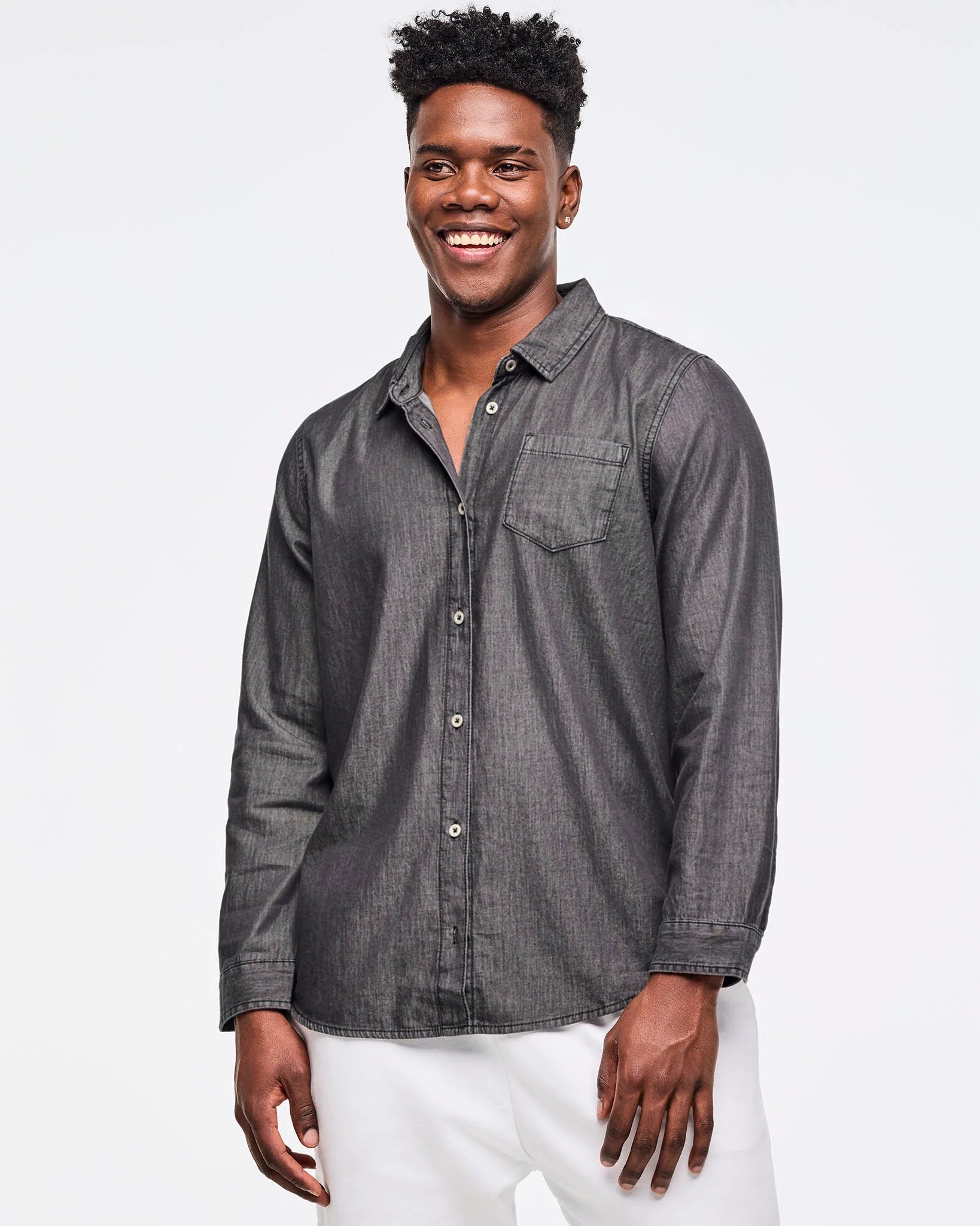 This button-down shirt features a front placket with working buttons, a back yoke, and a left chest pocket. The sleeves include functional buttoned cuffs for added style. Its multidirectional sequined designs shift from black when pushed down to silver when pushed up. With an easy fit and extended length, it combines comfort and dazzling appeal.